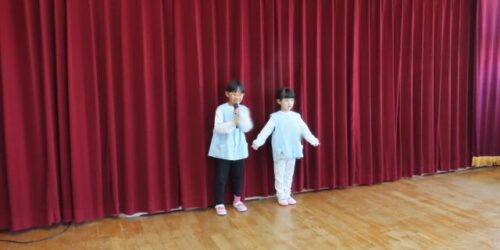 来週の金曜日に生活発表会を予定しています。今日はそのリハーサルの日。司会は年長組がします。 ピアノに合わせて・・・お辞儀...