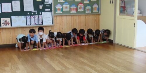 いつもはマットや跳び箱を先生に片づけていただいていますが、今日は年長さんで片づけました。みんなで協力するとあっという間に片づけることができました。