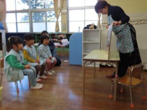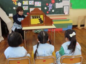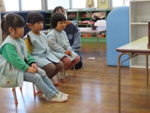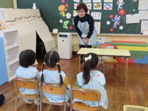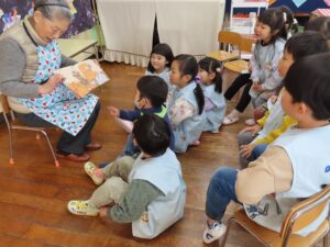 今日は、楽しみにしている「えほんだね」さんによる読み聞かせの日でした。学年に合わせた紙芝居や、絵本をいつも選んで読んでいただいています。年中組では、しりとりの絵本を子どもたちも一緒に考えながら読み進めていました。