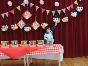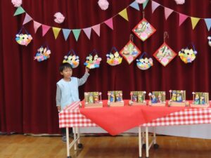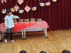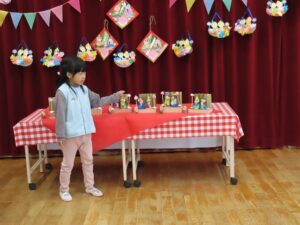 部屋で作った「ひな人形」をみんなの前で紹介しました。