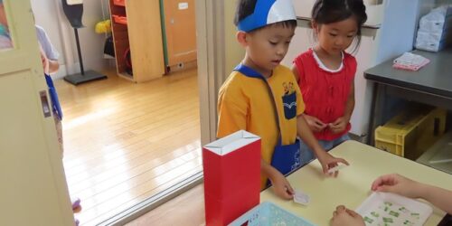 3月19日にれんげ組さんが卒園し、今日からさくら組とちゅうりっぷ組さんだけになりました。今日のわくわくタイムは年中さんが進めてくれました。まず、ドラえもんおんどを踊りました。