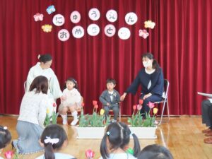 今日は伊勢寺幼稚園の入園式でした。ご来賓の皆様にご臨席をいただき、今年度は在園時も参加しての式となりました。