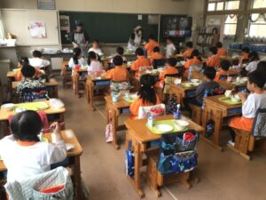 1年生は小学校で初めての給食です。おかわりをする子どももいて、みんなで全部食べて、食缶はからっぽでした!