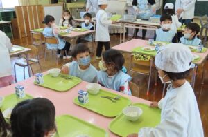 初めての給食、おいしかったね。明日からもたくさん食べて、大きくなろうね。