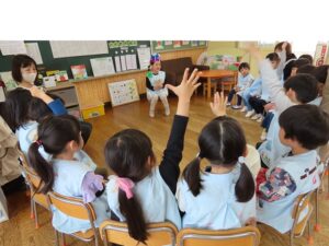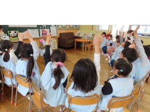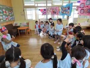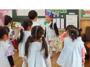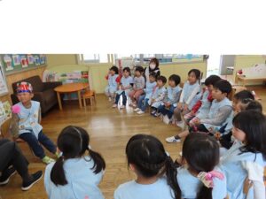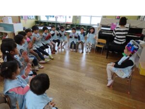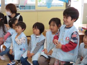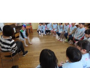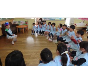年長組の誕生会に年中・少も参加しました。年長さんの誕生会が見たかった年中さんは、年長組の先生にお願いしたようです。