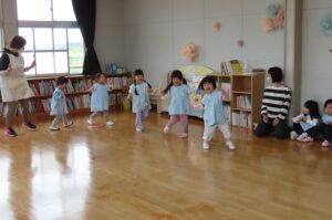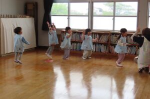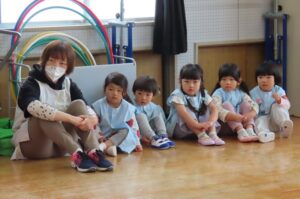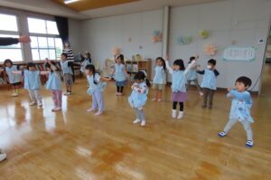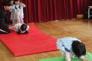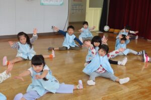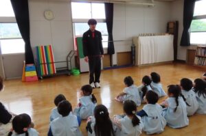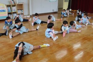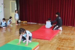 今年度最初の「体育で遊ぼう」がありました。伊勢寺幼稚園では年間10回相好体操クラブの先生に来ていただいて「体育で遊ぼう」を実施しています。今年度の先生は佐藤紘翔先生です。