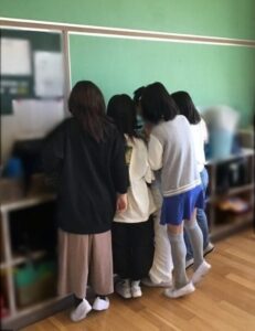 5年教室では、昨日掃除をして水草をいれたメダカの水槽に子どもたちが集まっていました。