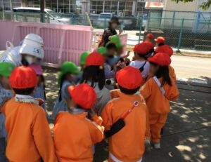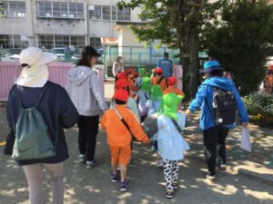 幼稚園の子どもたちと手をつないで出発です。今日は1年生がお兄さん・お姉さんです。