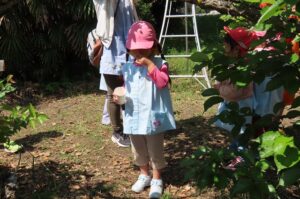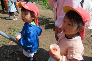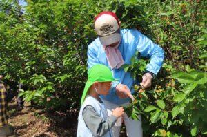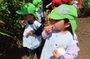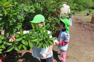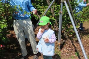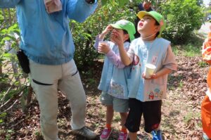 今日は『伊勢寺地域環境保全向上活動をする会』の皆さんにお世話になり伊勢寺小学校1年生のみんなと一緒にさくらんぼがりをしました。1年生のみんなが幼稚園に迎えに来てくれて手をつないで歩いて行きました。赤い実のなっている枝を地域の方に持っていただいたり、ここにあるよと教えていただいたりして自分たちでとって食べることができました。