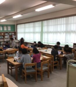 お米や米作りについて、タブレットや読書室の本を活用して調べています。