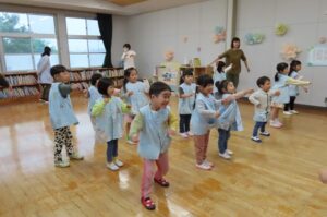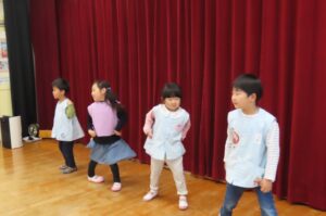 年長さんの当番が進めてくれました。まずは「さくらんぼたいそう」をしました。