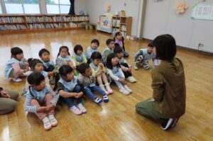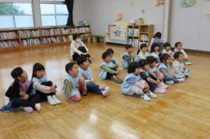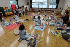 集中して聞いていました。お弁当は遊戯室でみんなでいただきました。