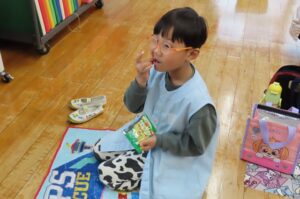 お弁当の後に、たからさがしで見つけたカードと交換したおやつを食べました。