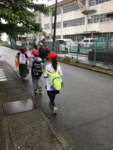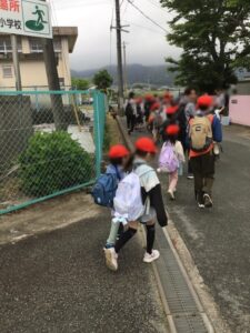 それぞれの班では、上級生が下級生を気遣って歩いたり班遊びをしていたり、雨が降ってきたら1年生に傘を渡していたり、1年生の荷物まとめを手伝っていたり・・・ さりげないやさしさがたくさんありました。