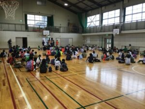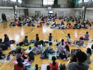 体育館になかよし班で集まり、お楽しみのお弁当&おやつタイムです。