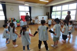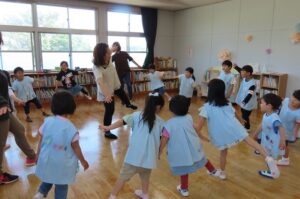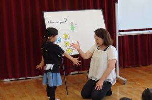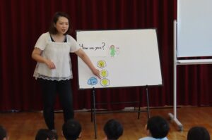 年間10回講師さんに来ていただいて、「英語で遊ぼう」を開催しています。今年度1回目です。今日のテーマは「How are you?」(ごきげんいかが?)です。