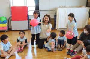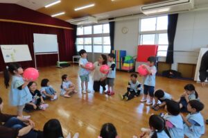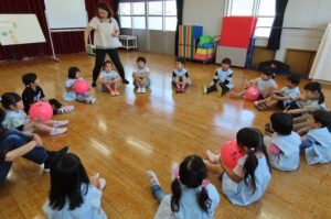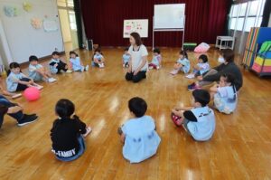 次のゲームは?音楽に合わせてボールを送っていきます。音楽が止まった時にボールを持っている子にみんなで「How are you?」と聞きます。ボールを持っている子が「I´m great」「I´m ok」「I´m bad」とこたえます。楽しくて思わず「I´m happy!」とこたえる場面もあり、先生からも「いいね。」とほめてもらいました。