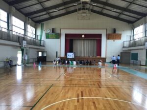 ソフトボール投げです。みんなで役割分担し、みんなで応援して測定しています。