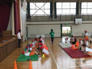 なかよし班で4つのグループに分かれて、反復横よび、上体おこし、立ち幅とび、長座体前屈を測定しました。