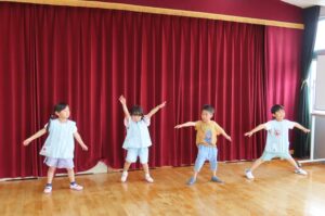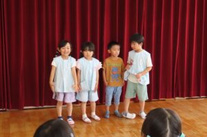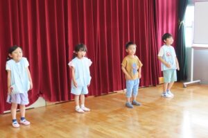 給食の時以外にも当番の仕事はあります。わくわくタイムの司会をします。「できるかなたいそうをします。ひろがってください。」