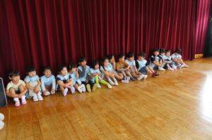 降園活動では、次の日の当番を紹介します。「○○さん、○○さんです。よろしくおねがいします。」
