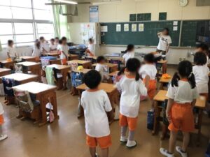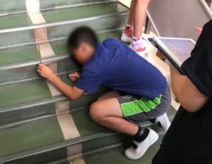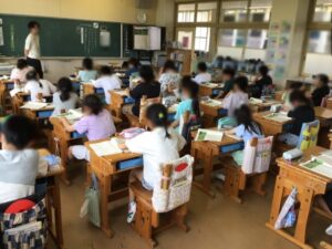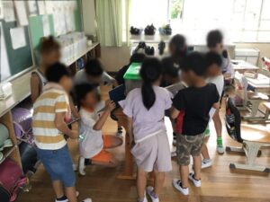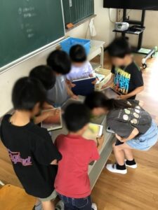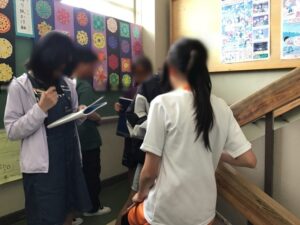 比例の関係について学習しています。学校の階段の高さを測って、表をつくったり計算をしたりしていました。