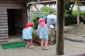 幼虫をさわっている年長さんを羨望のまなざしで見ています。