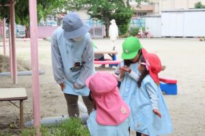 年長組があげはちょうを逃がしているところを見ていた年中・年少組さんも先生と一緒に幼虫を見つけました。「ここだよ。」「どこどこ。あっ、いた。」