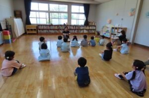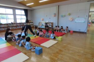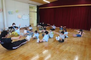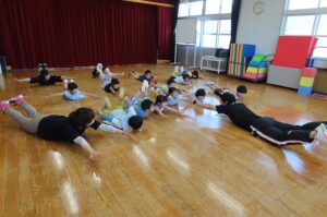 いつも楽しみにしている「体育で遊ぼう」の日でした。お話を聞いてから準備体操をしました。