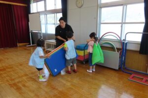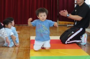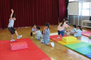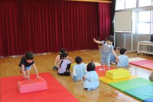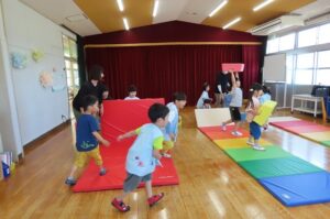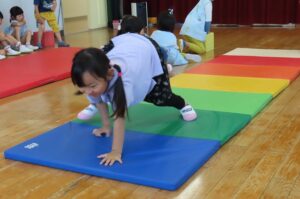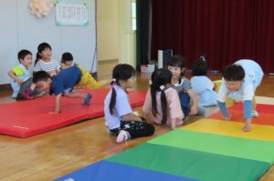 3つのグループに分かれて、マットの上をいろいろな動物になって歩きました。クマになったりペンギンになったりして歩きました。