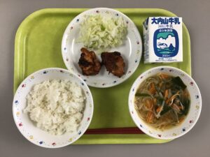 今日は「ちゃちゃもランチ(ご飯(麦入り)、牛乳、松阪とり焼き肉、添えキャベツ、ビーフン入り中華風スープ)」でした。おいしくいただきました!