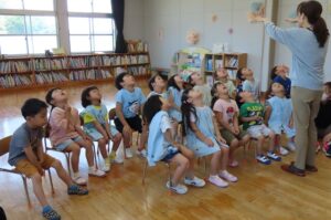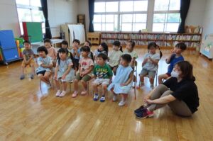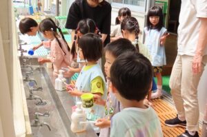 手を洗うのは、「外遊びの後」「給食前」「手が汚れたとき」等と確認した後、手の洗い方を教えていただきました。