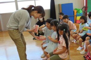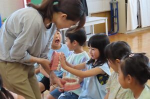 歯みがき指導の前に歯の模型で歯の形や並び方を見たりさわったりしました。