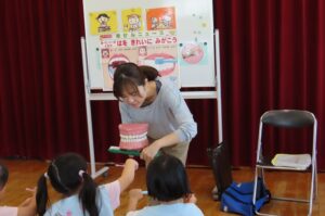 養護教諭の先生から歯みがき、手洗い、うがいの仕方を教えていただきました。
