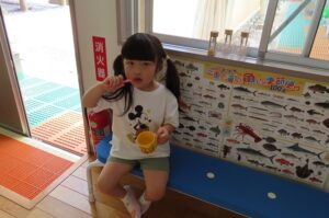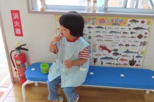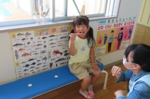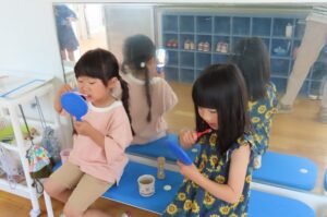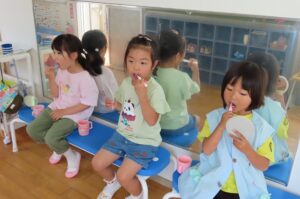 たくさんのことを教えていただきました。さて、食後の歯みがきですが、教わったようにできたかな。年中さんは園では初めてです。