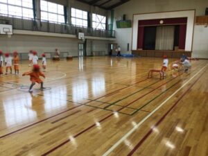 跳んだり、くぐったり、マットでころころしたり、ボールをついたり・・・ いろいろな動きをしながら体育館を1周しています。