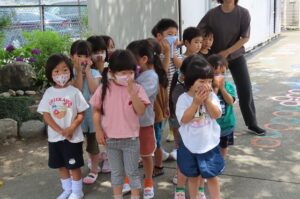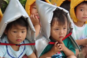 子どもたちの避難する様子から「火災」を想定した訓練だとわかっていただけたと思います。煙を吸いこまないようにハンカチやマスクで口・鼻を覆っています。