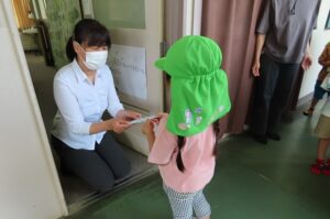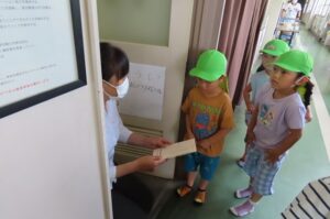 ちゃんと渡すことができました。校長先生から「気を付けて帰ってね。」の声掛けに「すぐそこだけどね。」とつぶやく年長さんでした。