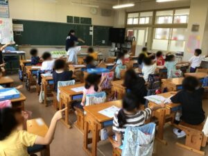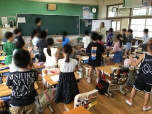 2つのグループにわかれて、曲に合わせてあいさつです。