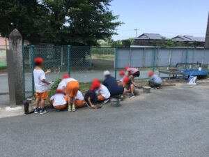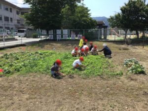 種をまいたひまわりとホウセンカが大きくなってきました。みんなで草とりです。