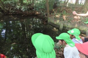 ぽこぽこと水が湧き出てくるところを見ることができました。湧水がこの川のせせらぎにつながっているのだそうです。