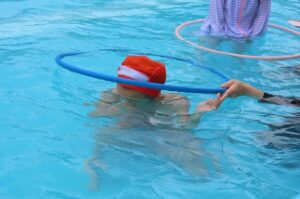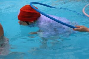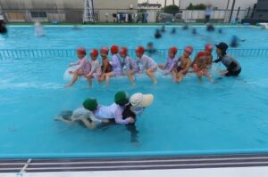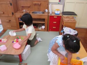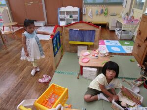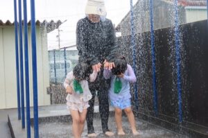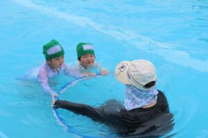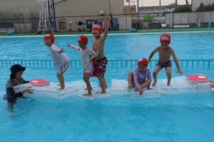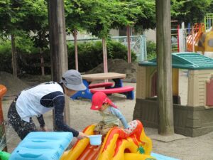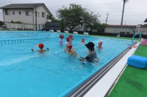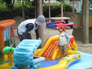 幼稚園では、水遊びをするちゅうりっぷさんと保育室で活動するちゅうりっぷさんさくらさんが楽しそう。
