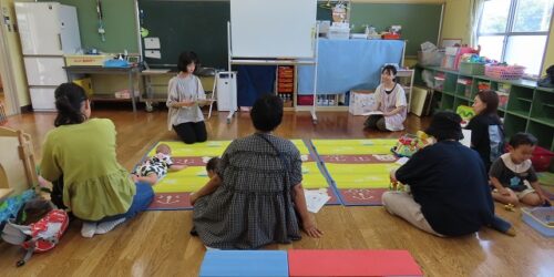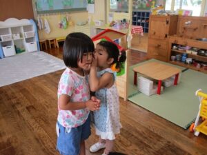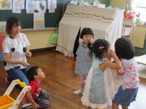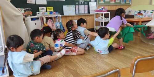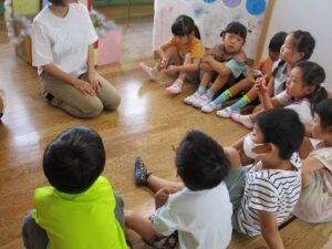 年中・年少さんは伝言ゲームをしています。今日のお祭りにかかわる内容のようです。