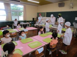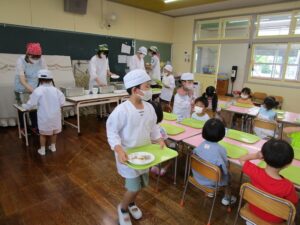 今日の給食は、夕方から夏まつりがあるので少し早めです。当番さん頑張っています。