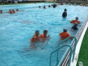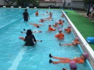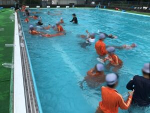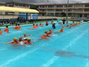 2限目の初めに少し雨が降りましたが、予定通り着衣水泳を行うことができました。