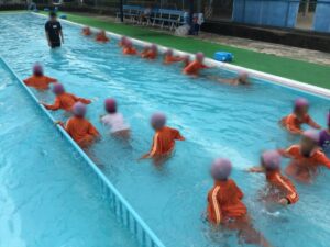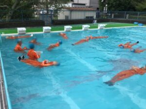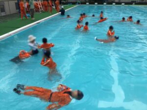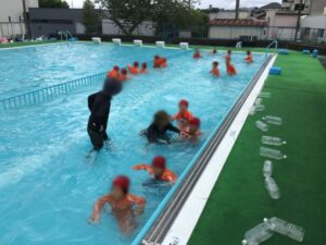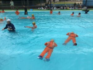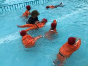 服を着たまま水に入った時の動きにくさや、ペットボトルを使った浮き方を体験しました。