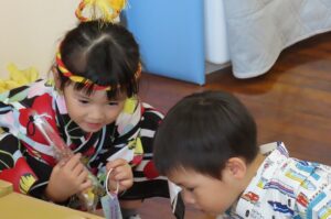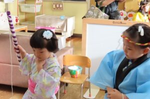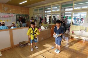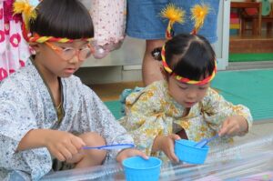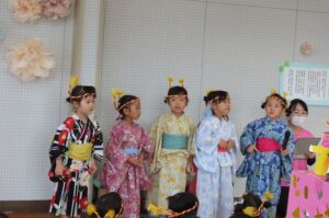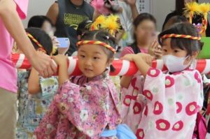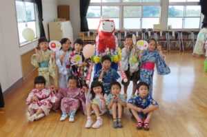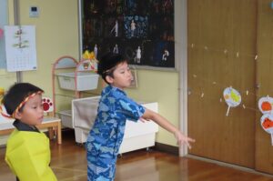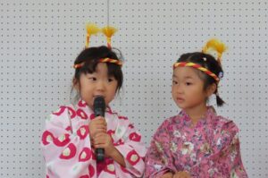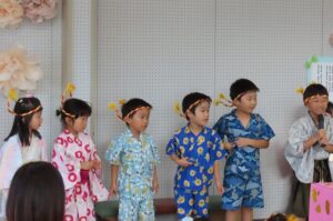 夏まつりを行いました。内容は、みこし、おどり、お店回りです。開会式閉会式の司会は、年長さんがしました。