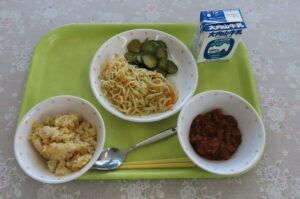 今日の給食は「チャーハン、牛乳、ジャージャー麺、きゅうりのさっぱり和え」でした。