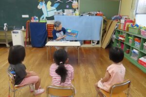 年少組の絵本は『しろさんとちびねこ』『うまうまあーん!』『ジャジャーン』『ぼくのどうぶつえん』『ぼくのくれよん』でした。