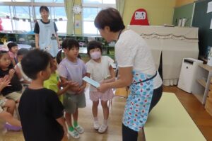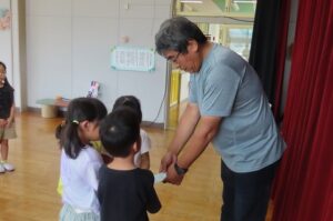 環境教育部の代表の方も来ていただいたので、年長さんから渡すことができました。